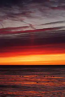 Sunrise is the instant at which the upper edge of the Sun appears above the horizon in the east. Sunrise should not be confused with dawn, which is the (variously defined) point at which the sky begins to lighten, some time before the sun itself appears, ending twilight. Because atmospheric refraction causes the sun to be seen while it is still below the horizon, both sunrise and sunset are, from one point of view, optical illusions. The sun also exhibits an optical illusion at sunrise similar to the moon illusion.