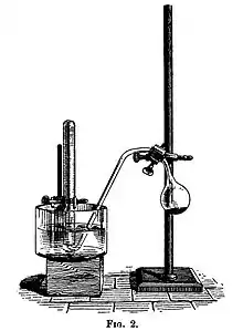 - When mercury is heated nearly to its boiling point in air, it is very slowly changed to a red powder, which used to be called calcined mercury. Lavoisier made a quantitative study of this change. ...(Fig. 1) The mercury was heated nearly to its boiling point by a furnace; red specks appeared on the surface of the mercury, and the volume of air in the bell-jar gradually decreased. The production of the red solid seemed to cease after some days, but the heating was continued for a few days longer (12 days in all). The volume of air in the bell-jar at the end of the experiment was noted; the red solid was collected, and weighed, and placed in a small glass bulb... (Fig. 2). When the red solid was strongly heated, mercury appeared on the upper and colder parts of the glass bulb, and a colourless gas collected in the graduated vessel. The heating was continued until the whole of the red powder disappeared... An examination of the gas collected in the cylinder proved it to be the substance which is now called oxygen.