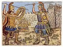 No two of earth's degenerate sons could raise.- Line 337. A similar line occurs in Book V, line 371: "Not two strong men the enormous weight could raise,/ Such men as live in these degenerate days".