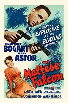 The Maltese Falcon is a 1941 film noir about a San Francisco private detective and his dealings with three unscrupulous adventurers, all of whom are competing to obtain a jewel-encrusted falcon statuette. The film has been named as one of the greatest films of all time by Roger Ebert and Entertainment Weekly, was cited by Panorama du Film Noir Américain as the first major film noir, and was selected for inclusion in the Library of Congress' National Film Registry in 1989.