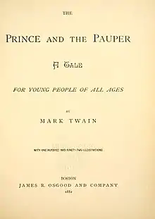 The Prince and the Pauper is a novel by American author Mark Twain. It was first published in 1881 in Canada, before its 1882 publication in the United States. The novel represents Twain's first attempt at historical fiction. Set in 1547, it tells the story of two young boys who are identical in appearance: Tom Canty, a pauper who lives with his abusive father in Offal Court off Pudding Lane in London, and Prince Edward, son of King Henry VIII.