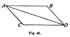 - The principle of the parallelogram of forces, at which Stevinus arrived and employed, (yet without expressly formulating it,) consists... of following truth. If a body A (Fig. 26) is acted by two forces whose directions coincide with the AB and AC, and whose magnitudes are proportional the lengths AB and AC, these two forces produce the same effect as a single force, which acts in the direction of the diagonal AD of the parallelogram ABCD and is proportional to that diagonal.