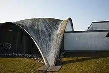 - Cement Hall, Swiss National Exhibition, Zurich (1939)... was built by architect and engineer Hans Leuzinger and Robert Maillart... to demonstrate the potential of thin shells. ...The width of this parabolic shell is 50.32 ft... built by the Gunite method, [it] is only 2.36 in thick. ...A sculptural piece by Robert Maillart entititled "Endless Ribbon" [1935-1936]... is a thin shell built of reinforced concrete. This... can be classified within Constructivism or... constructive spatial art. [I]t represents... the direct correlation between the language of sculpture and that of modern thin-shell architecture that moves the sensitive engineer such as Maillart to express himself also as a sculptor. Maillart's structural shells as a whole testify to this similarity of language... He was the father of flared columns connecting with floor slabs to eliminate supporting beams and designed unique bridge forms. Maillart's name remains associated with innovative concrete forms that extend to the structural virtuosity of thin shells.