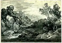 Gainsborough, c. 1785-88: 'Rocky wooded landscape with waterfall, castle and mountain', drawing in black chalk with stump