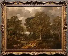 - Many of our landscape painters have made their pictures by a receipt. Never having lived out of the metropols or seen any green thing except a pickled cucumber in an oil shop, they form their ideas upon the style of the old Flemish masters.. .Very different was the conduct of Mr. Gainsborough when he painted his landscape. The woods of Suffolk were his Academy, the trees were his models.. ..the sunburnt inhabitants of his native village were the figures which he contemplated and copied. When he painted this picture painting: 'Cornard Wood' he was not twenty years of age, but at this early period he saw and imitated Nature as she is.. ..here we see a landscape in which every tree, every bough, one may almost say every leaf, is a portrait.. ..it has the force of a sketch. The forms of the trees, the bark, the exuberantly rich foreground, the woodmen and peasants, the two asses, are perfectly English, and prove that when Mr. Gainsborough painted cattle or figures he did not apply to prints from Berghem, Cuyp, or Paul Potter, but delineated them from the figures which he saw. The picture is placed too near the eye, in a more elevated situation the distant view of the village in the background would keep its proper distance.