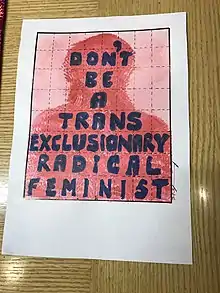 Trans exclusionary radical feminism rejects the assertion that trans women are women, supports exclusion of trans women from women's spaces, and opposes transgender rights.