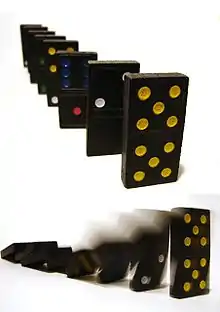 - [V causes his completed dominoes to fall. During this, a martial-law like world is shown, with people attacking police and military vehicles.]