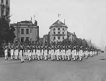 That's the spirit of V.M.I.!- Chorus of "The VMI Spirit", lyrics by Benjamin Bowering, VMI Class of 1915, first printed in The Cadet, the VMI cadet newspaper, on 3 April 1916, as quoted by Thomas W. Davis, The Corps Roots the Loudest: A History of VMI Athletics (Charlottesville: The University Press of Virginia, 1986), p. 44