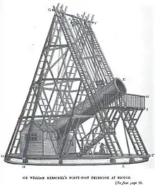 - In consequence of this arrangement I began to construct the forty-foot telescope about the latter end of 1785. The woodwork of the stand and machines for giving the required motions to the instrument were immediately put in hand. In the whole of the apparatus none but common workmen were employed, for I made drawings of every part of it, by which it was easy to execute the work, as I constantly inspected and directed every person's labor; though sometimes there were not less than forty different workmen employed at the same time. While the stand of the telescope was preparing, I also began the construction of the great mirror, of which I inspected the casting, grinding, and polishing, and the work was in this manner carried on with no other interruption than that occasioned by the removal of all the apparatus and materials from where I then lived, to my present situation at Slough.