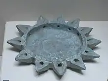 A Vedic/Avestan lamp used for invoking 'God' with 12 nozzles meant for lighting cotton wicks with the saucer for 'clarified butter' representing the 12 Zodiac signs. The origins of this design lies in the Vedas, specifically in Yajurveda