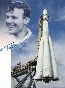 - Russian phrase, handwritten and signed after his historic spaceflight, photo of facsimile published in Syny goluboi planety 3rd.edition (1981) by L. Lebedev, A. Romanov, and B/ Luk'ianov; the first edition was translated into English as Sons of the Blue Planet (1973) by L. A. Lebedev