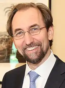 Zeid bin Ra’ad Zeid al-Hussein born (26 January 1964) in Amman, Jordan is a Jordanian diplomat who served as United Nations High Commissioner for Human Rights from 2014 to 2018. He played a central role in the establishment of the International Criminal Court, and was elected the first president of the Assembly of State Parties of the International Criminal Court in September 2002. He is career diplomat, son of Prince Ra'ad bin Zeid, Lord Chamberlain of Jordan, and Swedish-born Margaretha Inga Elisabeth Lind, subsequently known as Majda Raad. He is the apparent first in line to the throne of the Kingdom of Iraq.
